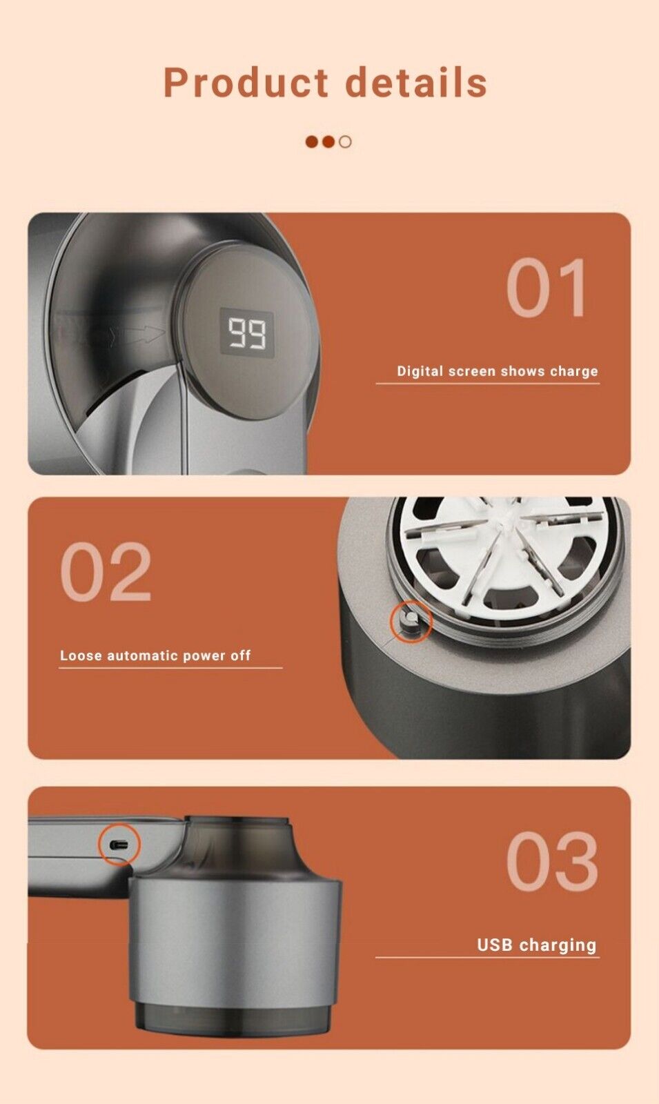 USB Charging (image inset) – Conveniently rechargeable via USB, making it eco-friendly and travel-ready without the need for disposable batteries.